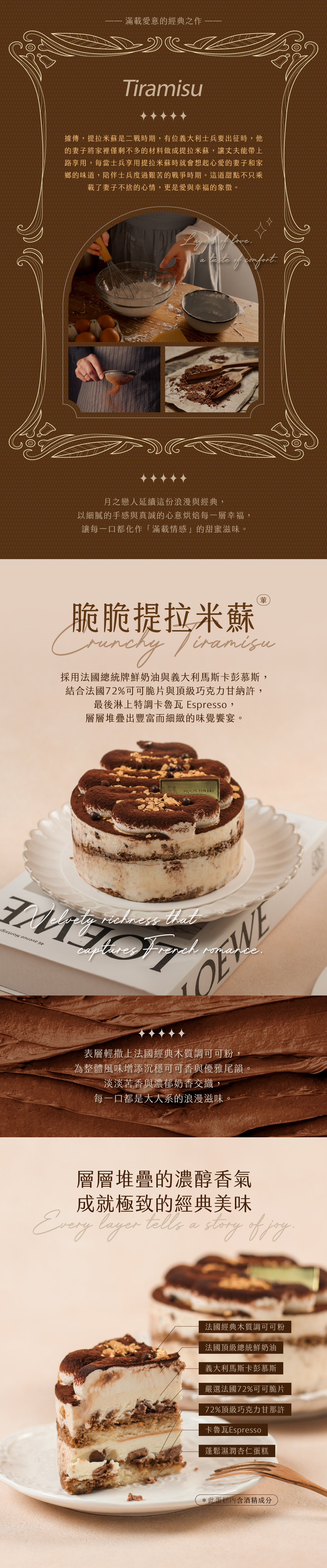 口感蓬鬆濕潤的杏仁蛋糕體,散發淡雅堅果香氣,佐以法國頂級鮮奶油、細緻提拉慕斯內餡與醇厚巧克力甘那許,融合咖啡酒的迷人餘韻,層層交織法國可可粉與巴芮脆片的細膩口感,在舌尖綻放出令人沉醉的豐富層次。
