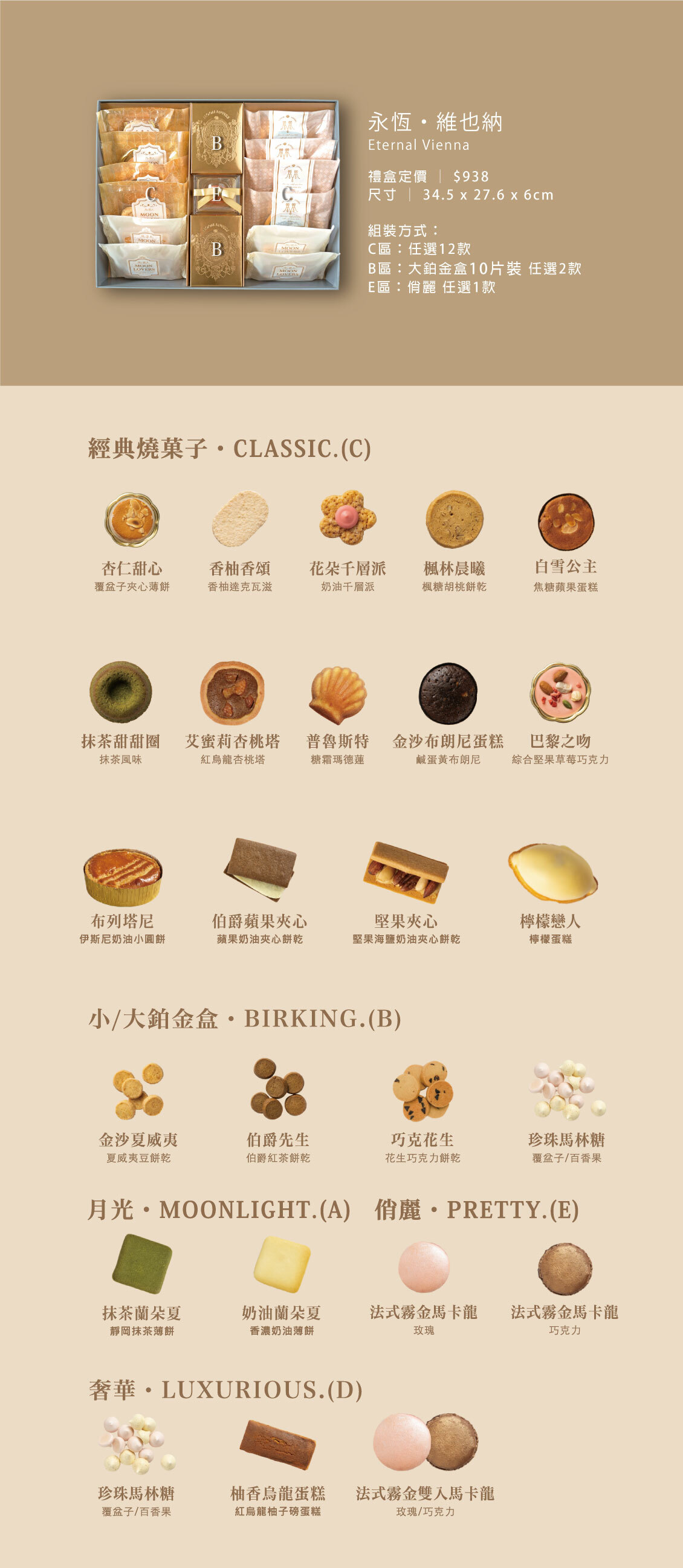 右:楓林晨曦胡桃餅乾*1、巴黎之吻*1、柑橘布朗尼*1、白雪公主焦糖蘋果蛋糕*1、伯爵蘋果夾心餅乾*1、香柚香頌*1