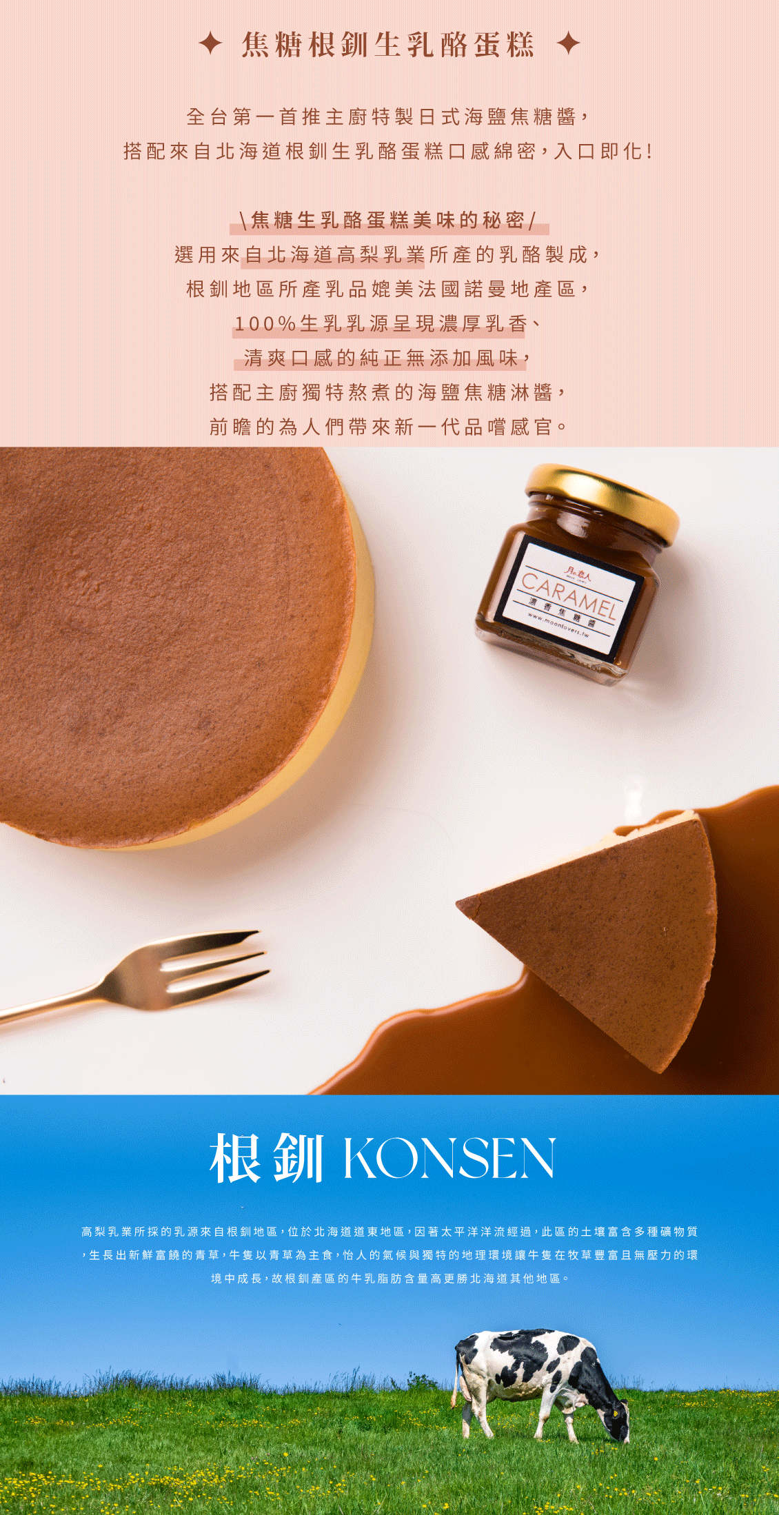 選用來自北海道高梨乳業所產的乳酪製成,根釧地區所產乳品媲美法國諾曼地產區,100%生乳乳源呈現濃厚乳香、清爽口感的純正無添加風味,搭配主廚獨特熬煮的海鹽焦糖淋醬,前瞻的為人們帶來新一代品嚐感官。